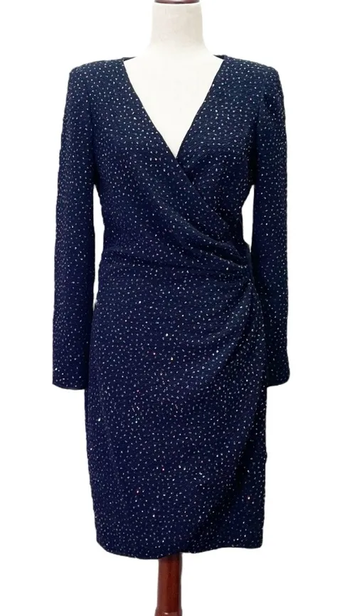 Vintage new old stock Reggio Millennium 2000 navy wrap dress size 10 with ruched side detail and long sleeves. Textured glitter dot fabric, classic and flattering fit. Vintage Reggio Millennium Collection 2000 wrap dress, originally sold at Dillard’s. This classic navy dress features a faux-wrap front with inner waist tie, ruched draping at the side with covered buttons, and a softly textured glitter dotted fabric. Amazing Y2K vintage deadstock! Millennium 2000 collection. Navy blue with crystal glitter textured dots. Wrap front, interior satin cord tie. Shoulder pads. Ruched side detail with covered buttons. 100% Polyester. Spot clean. Brand new with tags! Modeled photo is AI-generated. BRAND: Reggio for Rimini SIZE: 10 COLOR: navy PIT TO PIT: 17.5” WAIST: 14” HIPS: 17” SLEEVE: 23.5” LENGTH: 40” CONDITION: new with tags ORIGIN: Sri Lanka Marked sizes will vary by designer • All measurements are approximate and taken flat in inches • Color may vary on your screen. Occasions / Styling: Perfect for cocktail events, dinners, weddings, or office parties. Pairs well with heels or ankle boots and minimal jewelry for a polished, classic look.