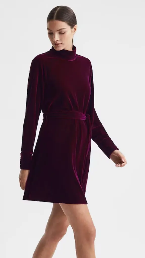 NWT DESCRIPTION Cut from velvet into a well-balanced silhouette, the Essie dress has long sleeves, a high neckline, and a belted mini length. Subtle openings feature the cuffs and behind the neck. Velvet High neckline Keyhole opening to reverse Self-tie waist belt Mini length Fit-and-flare silhouette