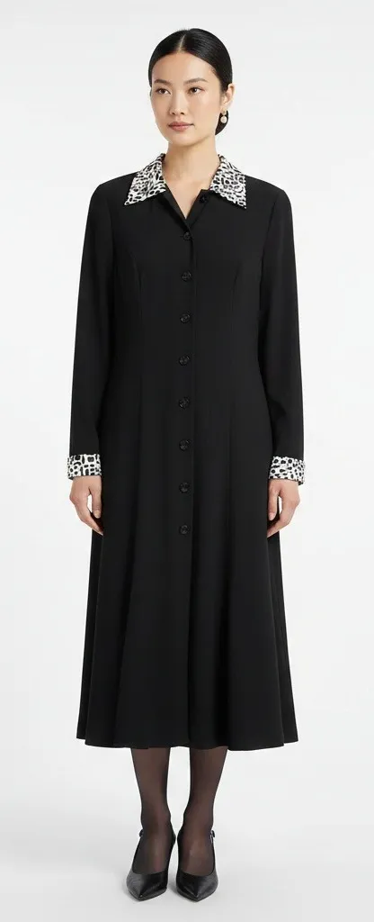 Abstract collar and cuff accents Button front closure Pointed collar style Woven fabric Structured fit Polyester material V-neckline Long sleeve Solid black with animal print contrast Midi dress style Fit & flare silhouette 77% Polyester, 21% Rayon, 2% Spandex Style# 360559 Sophisticated Professional Work Career Classiccore Event Formal Quiet Luxury Approx. Measurements: Pit to pit: 18" Sleeve length: 25" Length: 46"