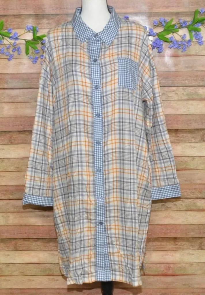 This lightweight flannel nightgown features a plaid gingham mixed print design. With a comfortable button front, it's perfect for cozy nights. • Long sleeves for warmth • Button front closure • Lightweight flannel • Mixed print plaid gingham • Rayon composition Location: Section 12 Please SEE measurements of the clothing items to insure fit! Measurements are in the last photo. To check measurements, measures a well fitting garment laying flat unstretched. We double the measurement for bust/chest/waist/hip/thigh and leg opening. Length is measured from shoulder to hem. Inseams are measured along the inseam. When you see TWO measurement for one area it is because the item has stretch and one is laying flat and the other is stretched. 🙂 Size: Womens XL Condition: New With Tags Thanks for looking at my listing. I have been selling online for several years and take pride in the items that I am listing and feel they will make a great addition to someone's wardrobe or home. All the items I am listing have been checked by several people and do not have any flaws such as holes, rips, or stains. Any issues a piece may have will be disclosed and will be included in the photos. Check out my other items to save on shipping! Please feel free to ask any questions you might have we are happy to answer 🙂 Happy Shopping!