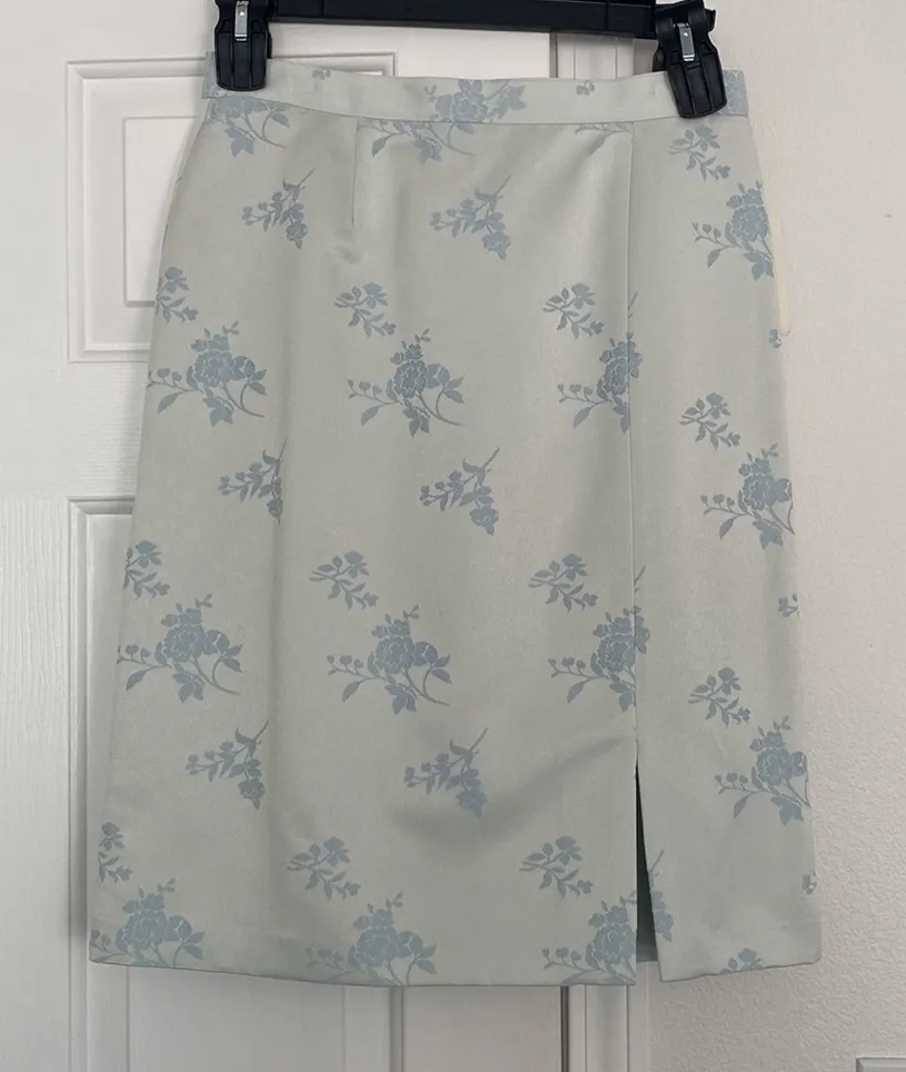 This skirt once belonged with a blazer but is being sold on it’s own. NWT. The palest blue with a whimsical floral print. Small leg slit in the front. Pencil length and style. Size 10. Lined. Zips and buttons in the back. Does also have some elastic in the waist (see photos) for comfort and fit. Style: Collared or ribbon blouse with nude heels. Vintage!