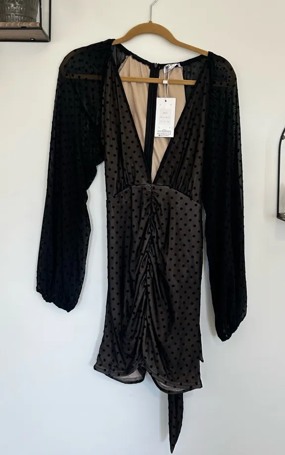 NWT Saint Genies Black Plunging V Neck Polkadot Ruched Mini Dress Size 12 Measurements (approxima... Show more