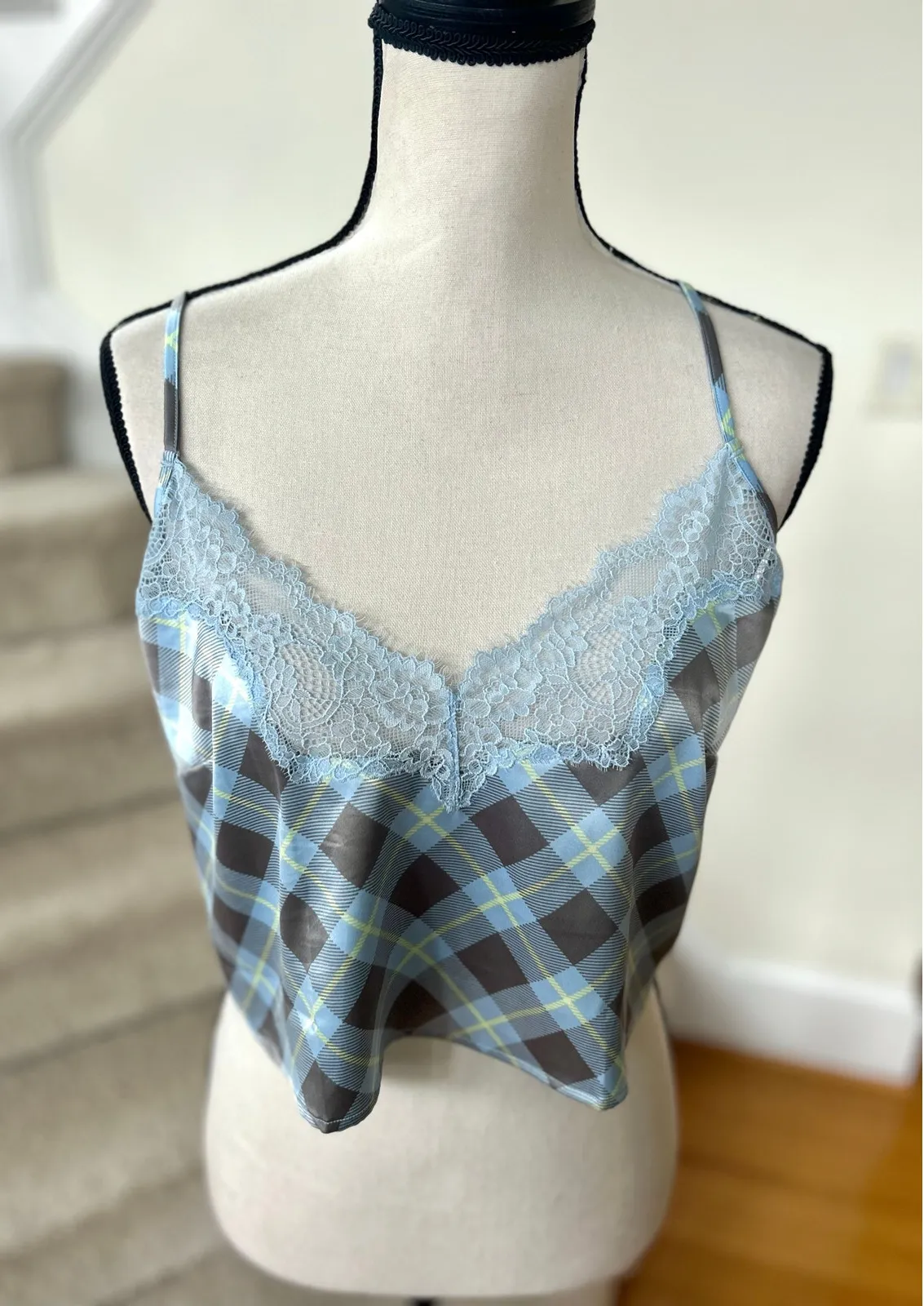 Excellent NWT condition. Baby blue and grey tartan plaid, cropped, lace at v-neck. Size Medium pit to pit 18 inches shoulder to hem 17.5 inches polyester/elastane grunge, whimsygoth, fairy, preppy, school girl