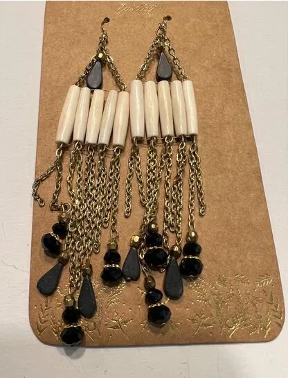 Statement earrings featuring an eclectic design. The earrings showcase a harmonious blend of textures and tones with a warm gold tone chain cascading from a sequence of ivory-colored beads, complemented by dark beads arranged in varying patterns, culminating in dark teardrop accents that add a touch of refined drama. A sophisticated accessory with a bohemian flair, these earrings are sure to elevate any ensemble. Keywords: Shiraleah, Chicago, Boho, Dangle Earrings, Drop Earrings, Gold Tone, Chain Earrings, Black Beads, Ivory Beads, Statement Earrings, Bohemian Earrings, Fashion Jewelry • I ship within three business days. • All items come from a pet-friendly, smoke-free home. • Please compare the measurements to something you already own.