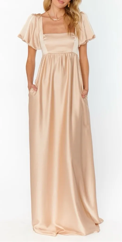 Elegant champagne satin maxi dress by Show Me Your Mumu. Puff sleeves, square neckline, smocked back... Show more