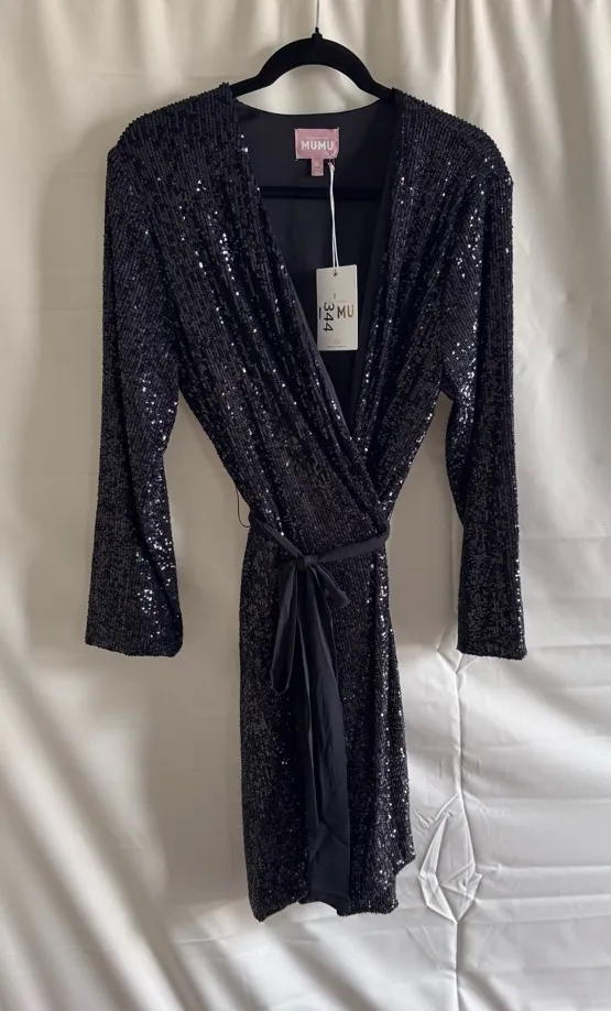 NWT Show Me Your Mumu Black sequin wrap dress with long sleeves and belt