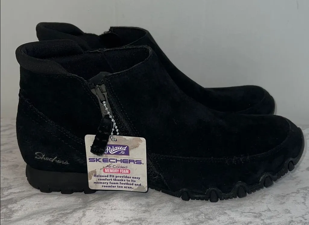 Chic black suede booties with side zipper. Comfortable and stylish for everyday wear.