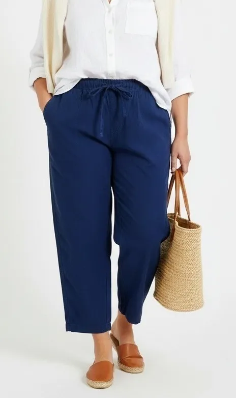 Woven cotton blend fabric 97% cotton 3% spandex Lightweight breathable feel Relaxed straight leg fit Mid rise Elastic waistband Drawstring closure Pull-on style Side pockets Solid pattern Casual comfort pant Classic Coastal grandmother Relaxed Everyday Loungewear Resort Approx. Measurements: Waist: 36" Rise: 12" Inseam: 26.5"
