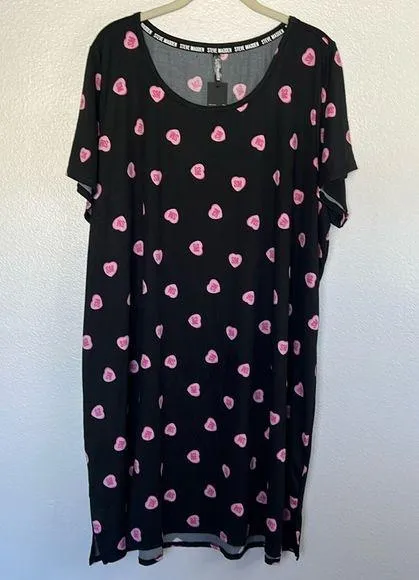 , no flaws noted Chic black dress featuring a playful pink heart pattern. stretchy Soft Approx.... Show more
