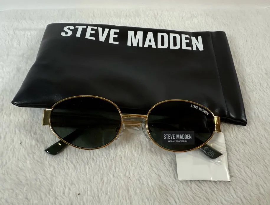 Steve Madden Mystie oval sunglasses with gold-tone frames and green lenses. Items are pre-owned and... Show more