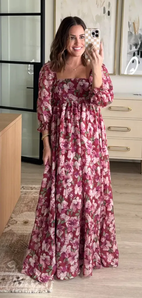 Size small Burgundy wine & pink flowers floral print Square neck Half 1/2 puff sleeves elbow