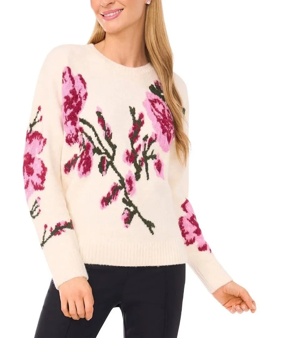 Cream floral embroidered crew neck long sleeve sweater. This cozy knit features a beautiful allover... Show more