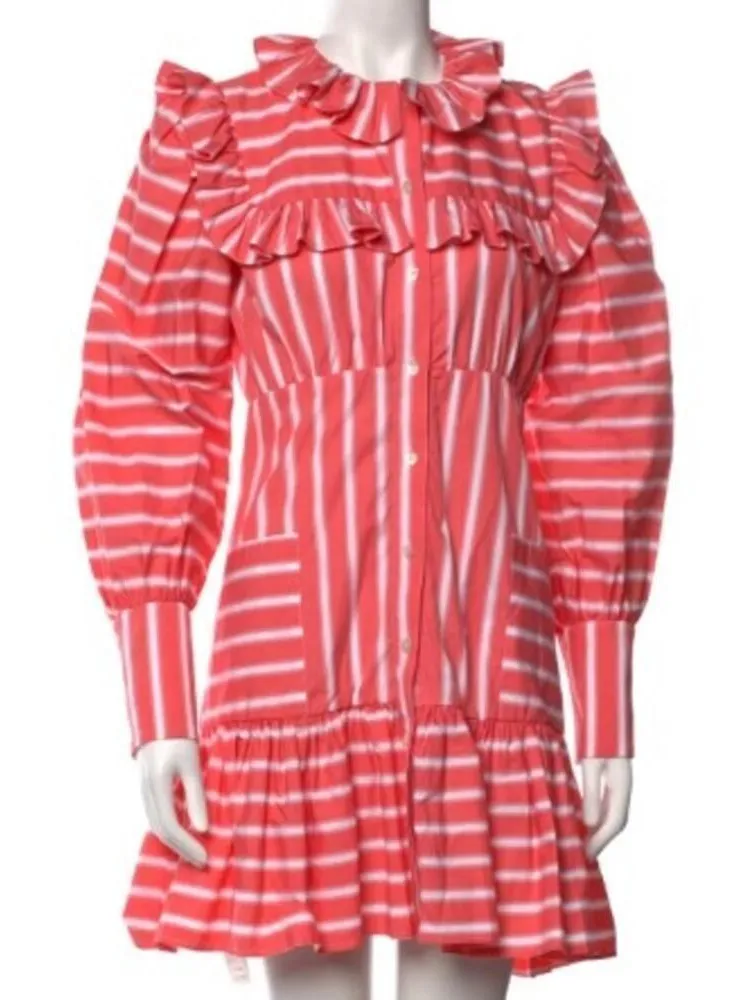 Thierry Colson Zelda Short Dress in Coral NWT Sz. S Retails $775 NEW WITH TAGS! One minor flaw---one button hole is loose, see last pic-but when buttoned doesn't show and there is no gap at all Button hole flaw Measures: 33"L front-34.5”L back, 17" armpit x armpit,14"waist (flat) Made in France 100% Cotton