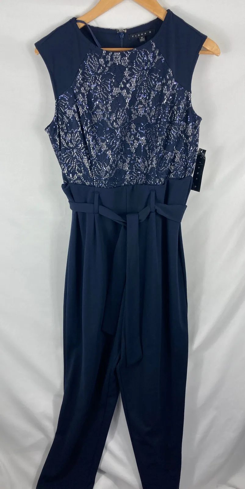 This is a New With Tags Tiana B sparkle top blue sleeveless jumpsuit with tie waist in size 12. The jumpsuit is perfect for a night out or a special occasion. The sparkle top adds a touch of glamour, while the tie waist creates a flattering silhouette. Features: - Brand: Tiana B - Color: Blue - Sleeves: Sleeveless - Size: 12 - Condition: New with tags This jumpsuit is a must-have for any fashion-savvy woman. It is sure to turn heads wherever you go!