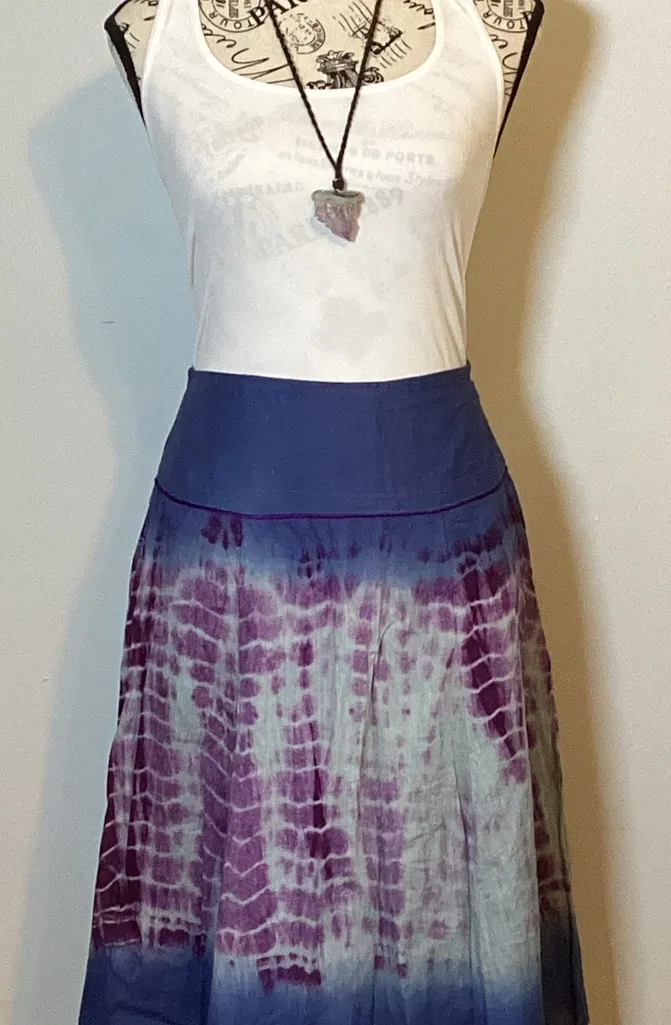 Mix Nouveau ladies skirt is a must-have for any festival attending girl. The skirt features a unique tie-dye pattern in blue and purple, which adds a touch of bohemian flair to any outfit. It is made of 100% cotton fabric, which makes it comfortable to wear in any season. The skirt has a high rise and a flared hemline, giving it a flowy, hippie look. No shoes required ✌️👣☮️ Approximately length 24”