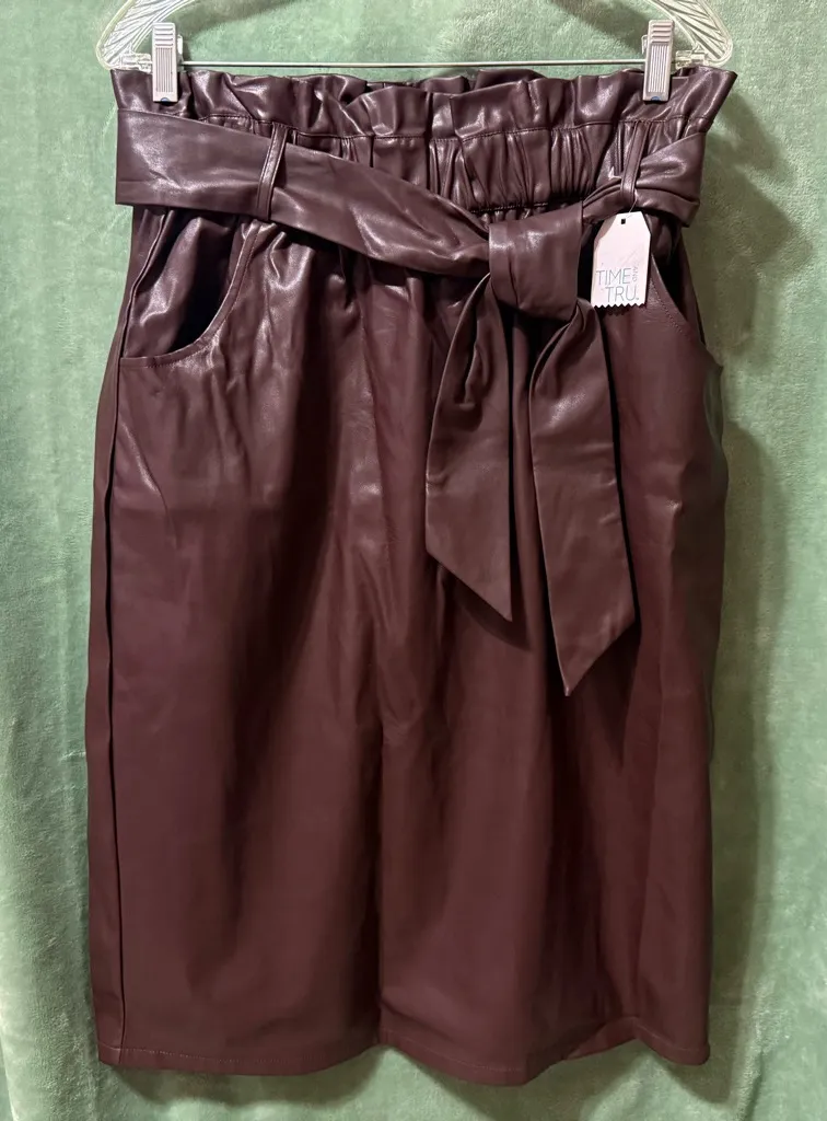 NWT Time & Tru Faux Brown Leather Skirt Faux leather midi skirt with a paperbag waist + belt Sleek... Show more