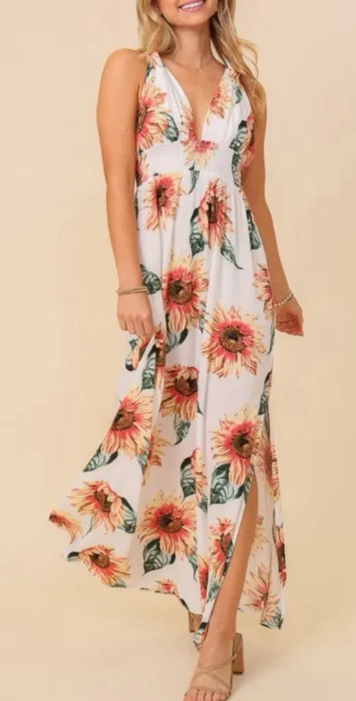 Chic maxi dress with bold sunflower print. Perfect for sunny days. #timing #losangeles #sunflowerde... Show more