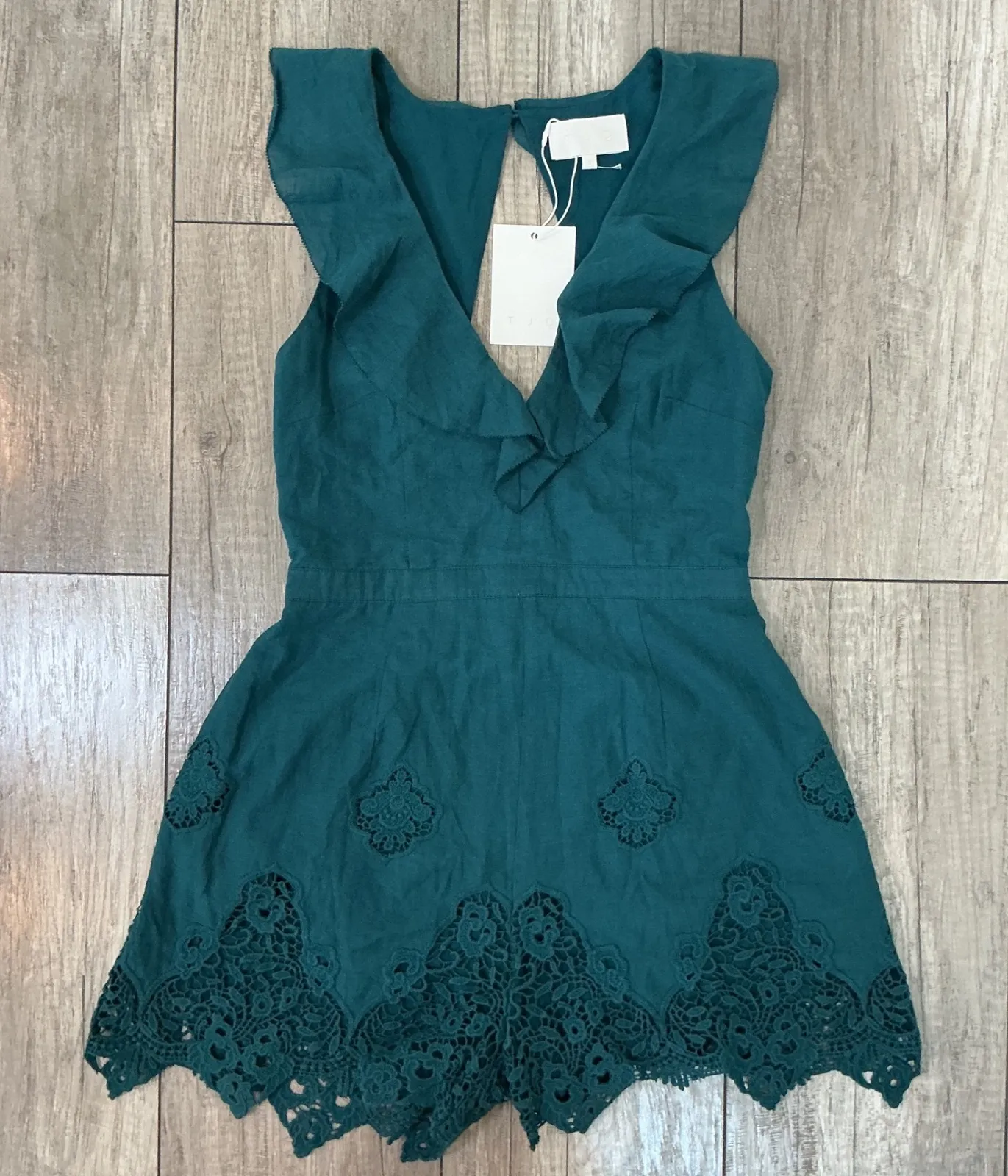 Enchanting dress casts a spell of effortless elegance. Ruffled trim frames the V-neckline, adding a touch of playful charm. The sleeveless design keeps you cool and comfortable, while the intricate lace hem elevates the look with a touch of sophistication. The mini length is perfect for showing off your legs, and the open back adds a hint of allure. This dress is ideal for a summer garden party, a romantic date night, or a casual brunch with friends. Measurements: • Waist: 12.5" Style: Mini Dress Length: Short Color: Green Department: Women Sleeve Length: Sleeveless Pattern: Solid Occasion: Party/Cocktail, Casual Material: Linen Neckline: V-Neck Character: Boho Chic, Elegant, Romantic, Summer, Party Fabric Type: Woven Season: Spring, Summer Sleeve Type: Cap Sleeve Closure: Zip Keywords: TJD, dress, mini dress, sleeveless, green dress, ruffle trim, lace hem, party dress, summer dress, boho dress, bohemian, casual dress, women's dress, size small, open back