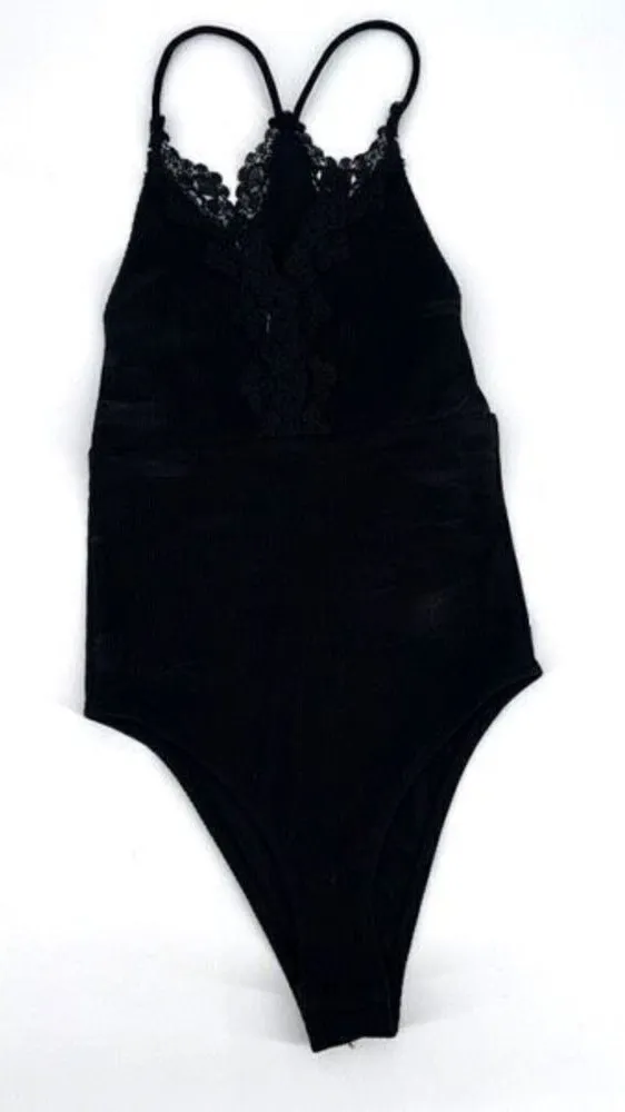 NWT Topshop Bodysuit Top Ribbed Knit and Lace Trim Strappy Straps Black Size US 2 This was tried... Show more