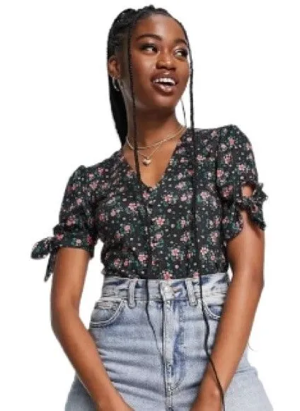 NWT TopShop Ditsy Floral V-Neck Bodysuit Size XS Drapey tie sleeves charm this curve- accentuating... Show more