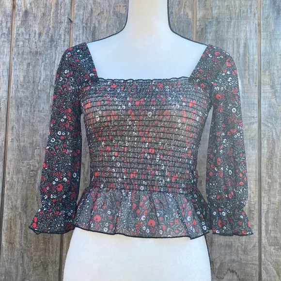NWT Topshop Floral Smocked Top Size 4 Strappy Back Roses Ruffle Trim Square Neck
