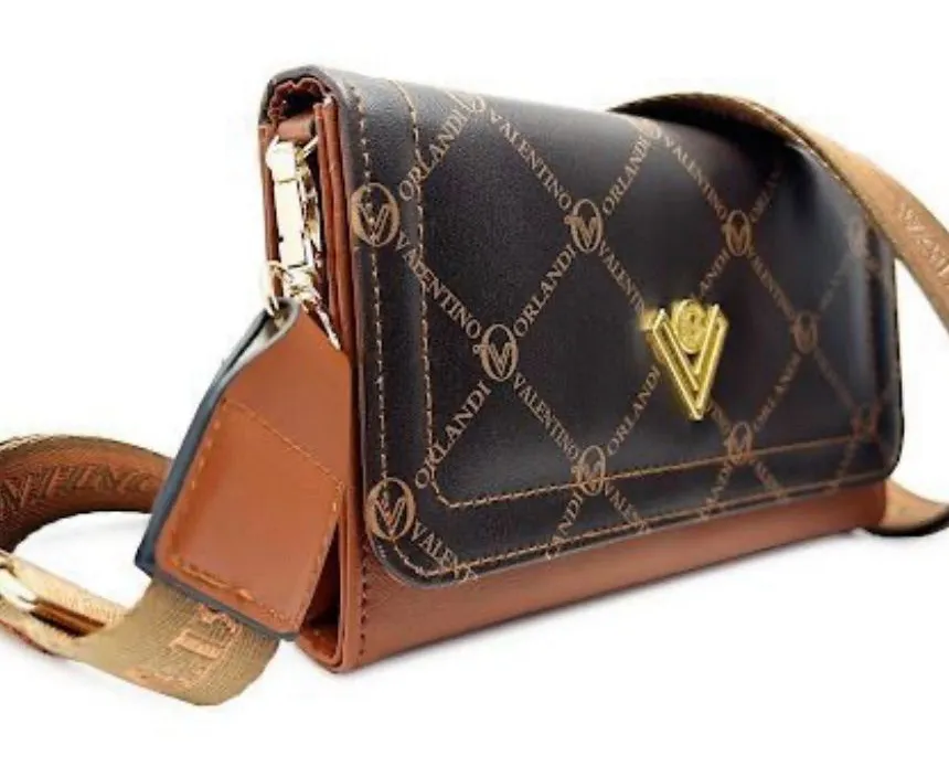 . Condition is New with tags This beautiful crossbody bag by Valentino Orlandi features a unique printed design and is made of high-quality faux leather in a beautiful brown color. It has a snap closure and a detachable strap for added convenience. The bag is small, measuring 8 inches in width, 5 inches in height, and 4 inches in depth. This Italian-themed bag has a guitar strap and a printed logo accent. It is perfect for travel, casual outings, workwear, or business settings. The bag is lightweight and has an adjustable canvas strap in copper color. The interior is lined with brown leather and has enough space for your essentials. This Valentino VLogo bag is a must-have for any fashion-forward woman!
