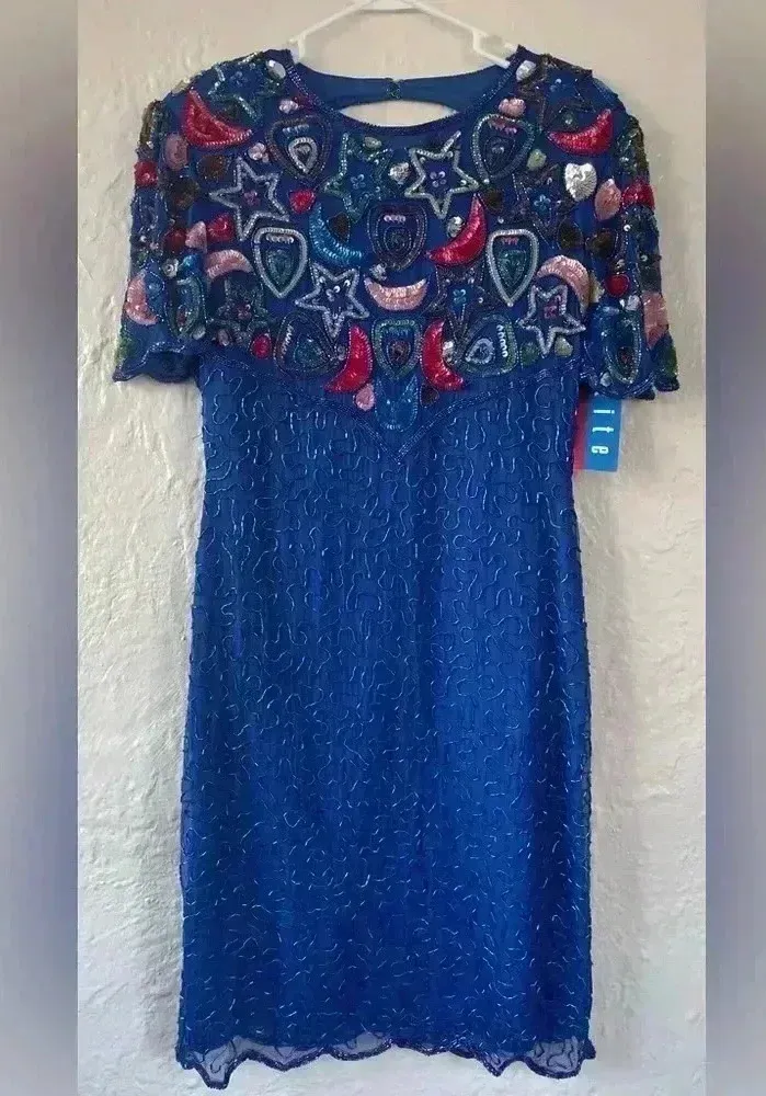 NWT Vintage 100% silk bright blue beaded sequined midi length cocktail dress with cap sleeves and cu... Show more