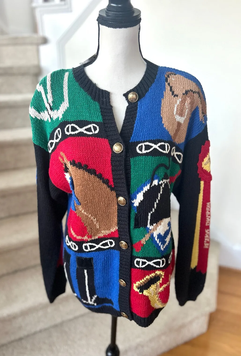Excellent condition, new with tags deadstock. Classic knit cardigan, button front, long sleeves. Featuring horse head, horns, and racing riders. Champion ribbons down the sleeves. Size Medium (oversize) pit to pit 20 inches shoulder to hem 25 inches cotton/ramie