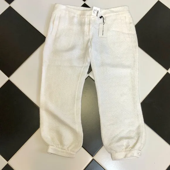 White textured woven pants Ivory bone shiny kind of silver finish 66% acetate 17% polyester 17% cotton Approx measurements laying flat Waist 16.5” Rise 8” Inseam 25.25” Bottom cuff diameter 5.5” (leg opening) Hip 20.5” Made in Italy Streetwear Cropped straight leg pants with cuffed ankle button detail Scrunched ruched leg cuffs Fabric buttons Excellent quality and condition Vintage look Yacht rock 80s sailing summertime hamptons white party Memorial Day vacation beach honeymoon summer mod retro vintage 80s 90s