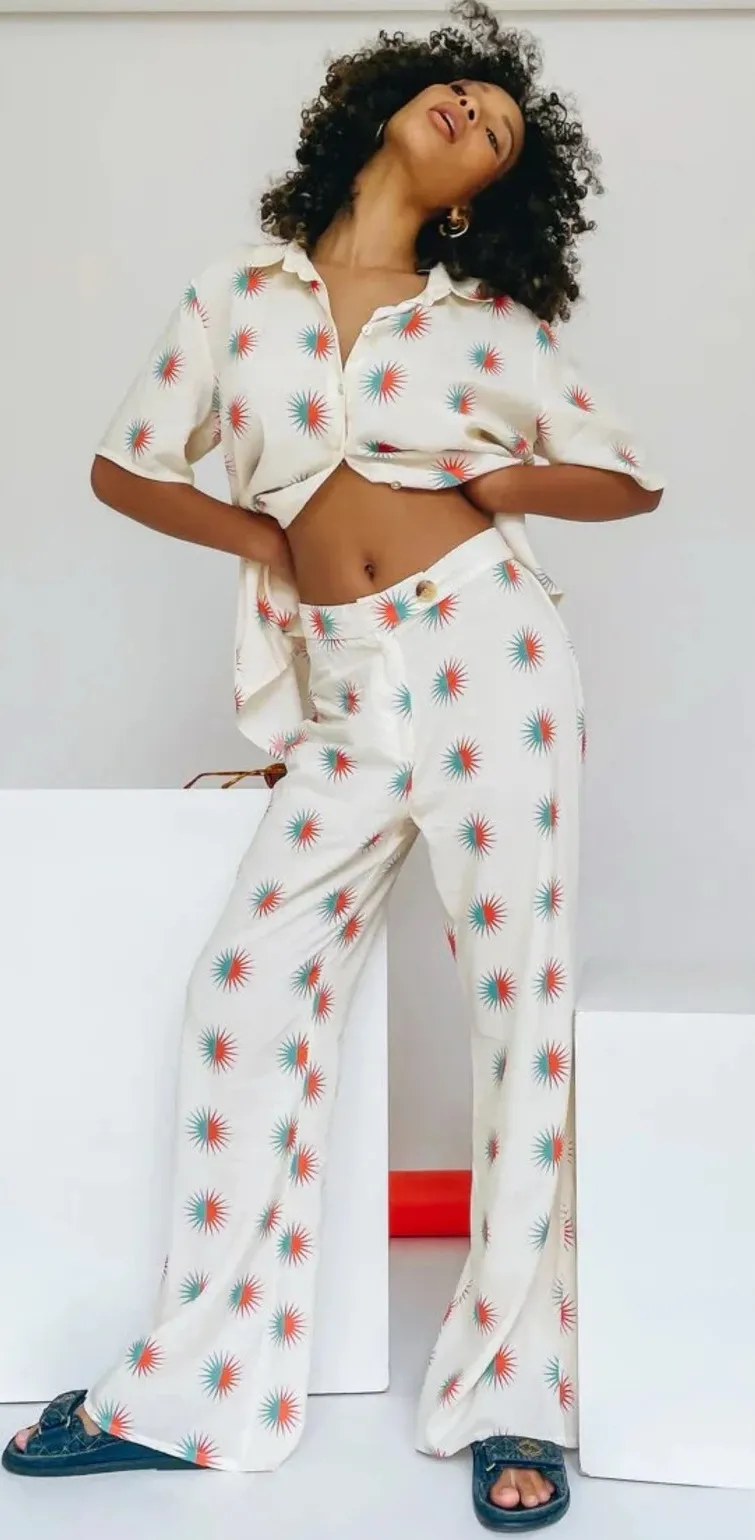New with tags- small mark on side (photo) Cream with a burnt orange and blue sun print High rise Zipper button closure Elastic waist Wide leg Lightweight Semi sheer 100% cotton #1g428 All measurements are taken laying flat and approximate: Bust: 11.5” Waist: 14.5” Length: 42” Tags: boho, bohemian, hippie, hipster, festival, beach, summer, spring, fringe, western, trendy, cute, chic, minimalist, quiet luxury