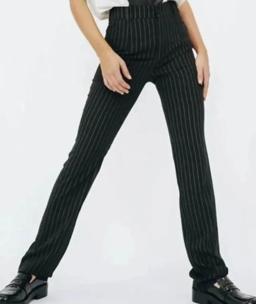 These are NWT VRG GRL V400302-8 Black Pinstripe Pants Mob Wife Retro Size 8. In excellent condition. Brand new with tags attached. See all pics for condition. Tailored black pinstripe pants designed with a sleek, modern silhouette and timeless appeal. Featuring a high-rise waist with a flattering, structured fit through the hips and a straight-to-slim leg that elongates the frame. Classic vertical white pinstripes add a sharp, polished look ideal for workwear, business casual, or elevated everyday styling. Crafted from a smooth woven fabric that offers comfort while maintaining a refined shape. Finished with a clean front, subtle stretch for ease of movement, and a versatile length that pairs effortlessly with loafers, heels, or ankle boots. Perfect for office outfits, minimalist wardrobes, or chic, tailored street style looks. Waist- 12.5" Length- 41.5" Inseam- 30.5" Rise- 10.5" B38 Neutral Minimalist Contemporary Black Essentials Business Casual Casual Classic Workwear Oversized Knit Back to School Fall Fashion Spring Summer Vacation Trendy Winter