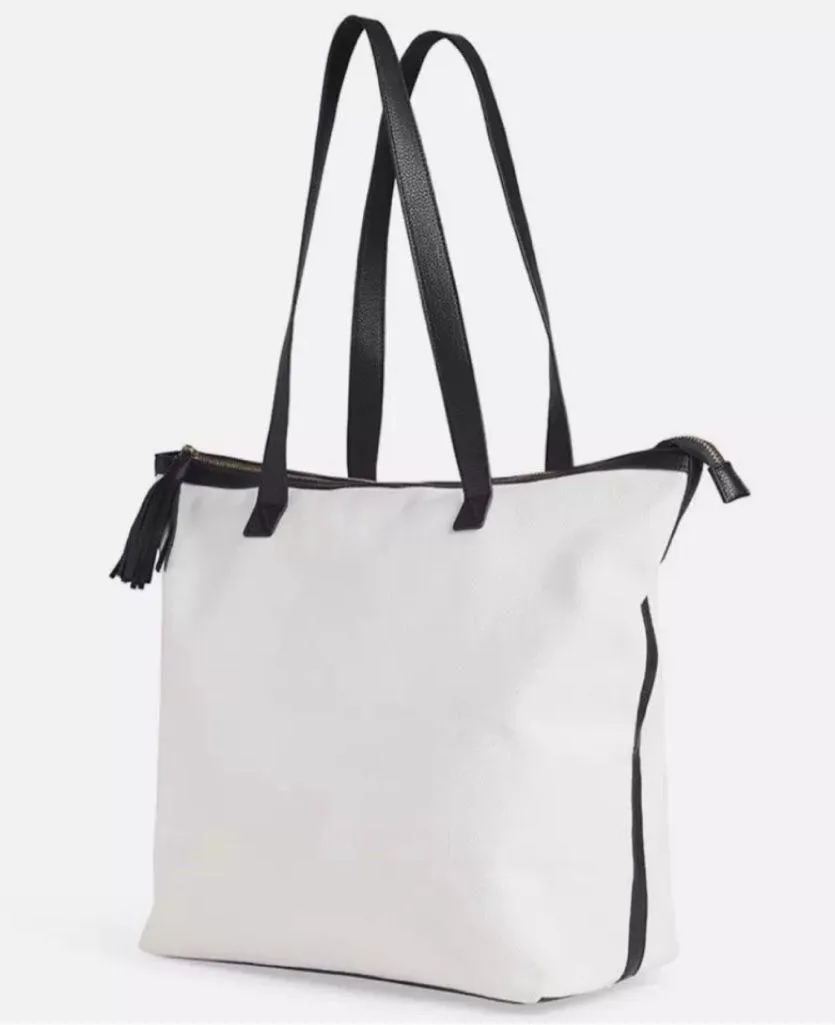 A classic canvas and vegan leather tote perfect for women who want a stylish and functional handbag. The bag features a solid pattern and zip closure with double handles in black, making it a versatile accessory for any occasion. The exterior is made of high-quality leather, while the interior is lined with a combination of canvas and leather in black. Measuring large, this tote is spacious enough to fit all your essentials. This classic canvas tote works beautifully as a carry-on as it's just the right size for transporting you travel must-haves. Canvas and vegan leather Approx Measurements: 13" Base Width 18" Top Width 14.5" Tall