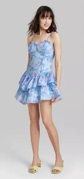 Wild Fable Floral Tiered Jacquard Fit & Flare Mini Dress. Colors: Blue, teal and pink. Pastel colo... Show more