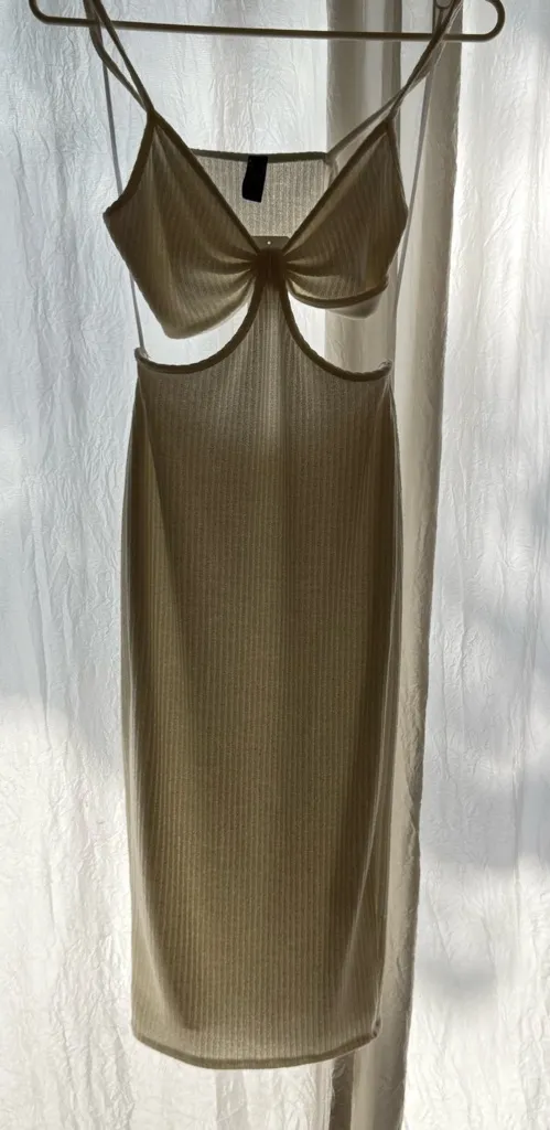 Elegant cream midi dress. Features cut-out design. Spaghetti straps. Perfect for any occasion.