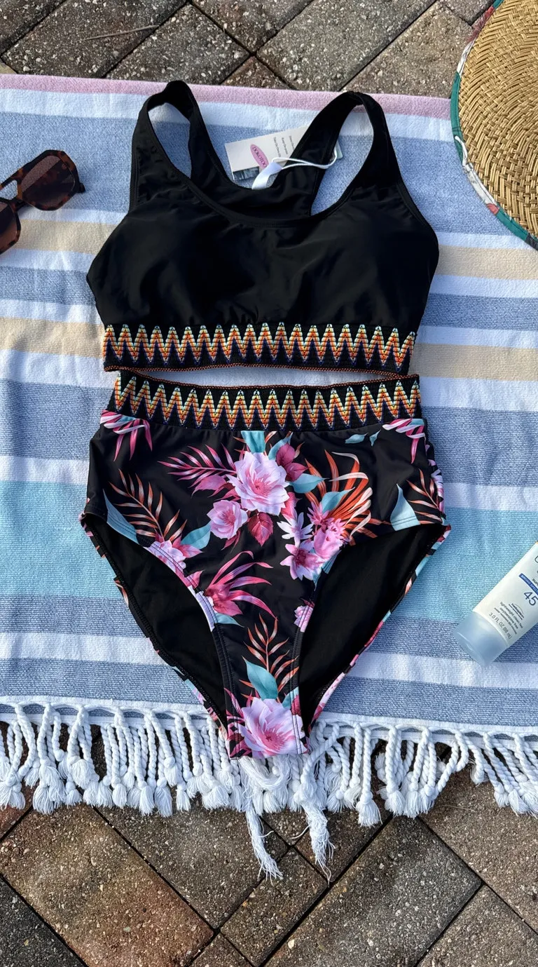 Vacation-ready bikini set – add to your getaway wardrobe 🌴 Last call – swimsuit season is here and you NEED this one!!! Brand: Dokotoo Size: M Condition: NWT Style: High Waisted Bikini Set Color: Black and Floral Features: Beautiful embroidered top band and waistband Listing Notes: See Photos for approximate measurements Keywords: #bikinitop #aerieswim #vacationvibes