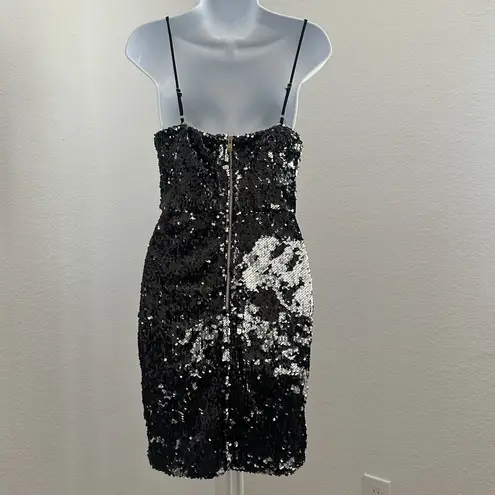FEATURES New with tags! Dress features a back zipper entry, adjustable spaghetti straps, built in breast cups for support and padding, and it is fully lined. FLAWS N/A BRAND Lucy Wang TAG SIZE Small COLOR Black and silver SHELL FABRIC Polyester APPROXIMATE MEASUREMENTS OF DRESS Length (underarm neck to hem): 26"