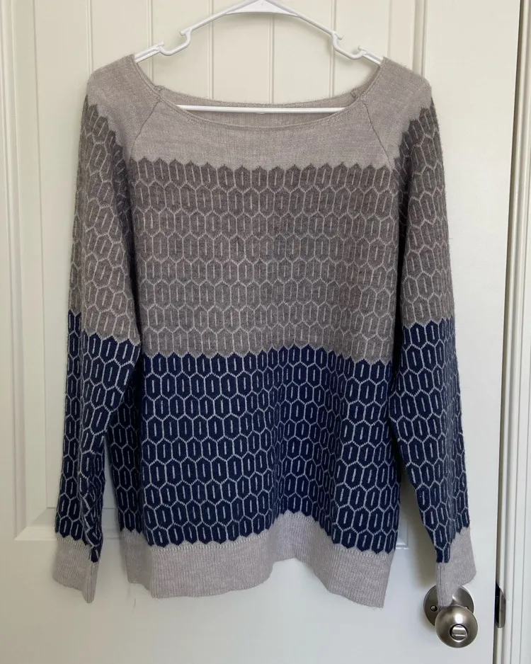 Women’s sweater. Sweater is multiple shades of gray & blue with a geometric pattern. Material is so... Show more