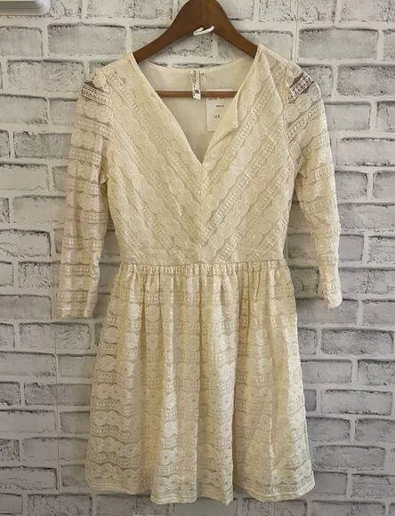 NWT! Women’s. Pink Owl. Cream colored lace dress. V-neck. 3/4 length sleeves. Lined. Size Small. Thank you for shopping with me. Shop with confidence from a 5 star rated seller across multiple platforms. Typically items ship within 24 hours of purchase. Returns/exchanges are not accepted.