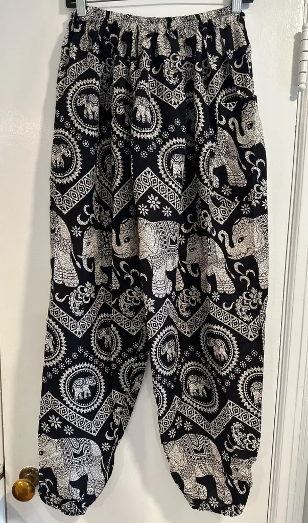 Stylish and comfortable women's pants featuring an elegant elephant print. Perfect for casual outings or lounging at home. The black and white design adds a classic touch to your wardrobe. NWT Women’s Sz: M Elephant Harem Black White Elastic Waist Relax Fit Baggy Pants. Large patch pockets. Excellent condition. Never worn. No rips, Stains or defects. Please see pictures for measurements.