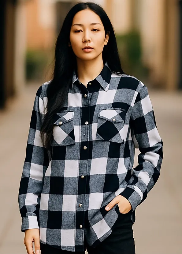 WRANGLER retro buffalo plaid black & white print long sleeve snap up Western boyfriend flannel shirt... Show more
