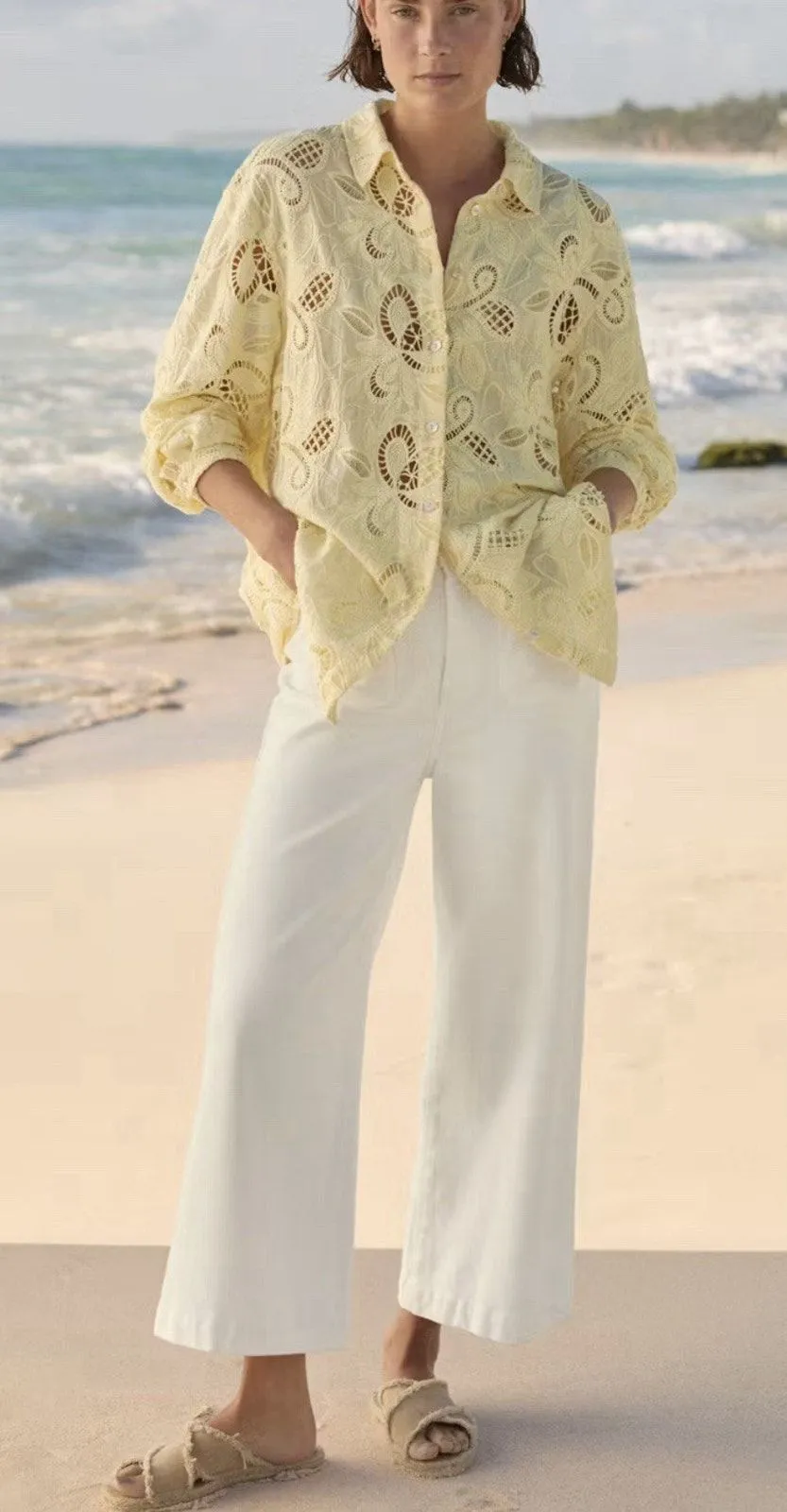 New with tags Wrap London Women’s Size 14 White Cropped Wide Leg Trousers Fab pair of cropped wide-legged denim trousers with a touch of elastane for easy fit. With neat patch-pockets at the front and loops for your favourite belt, these look great with sandals. 98% Organic Cotton 2% Recycled Elastane, Trim 100% Cotton Garment mineral dyed cotton denim, with a touch of elastane for ease of fit Dyed with environmentally-friendly, natural mineral-dyes Zip and button fastening at fly Belt loops Patch-pockets at front Welt pockets with profile stitching at back Deep hem finish Length 33” Inseam 21” Waist 18.5” CC029