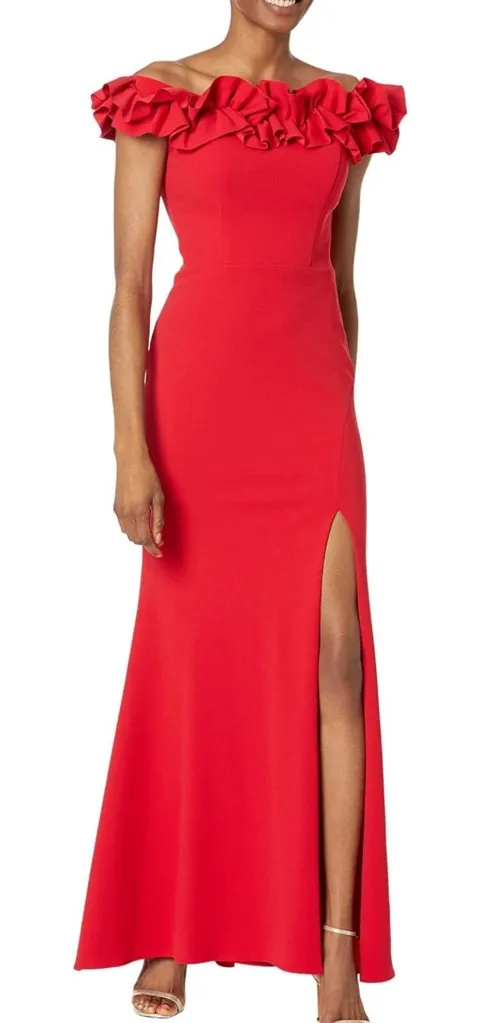 Details & care Make it an unforgettable night in this crepe gown featuring a ruffled off-the-shoulder neckline and a flirty side slit that allows you to move effortlessly. • 56 1/2" Center Front Length (Size 8) • Off-the-shoulder neck • Short sleeves • Lined • 94% polyester, 6% spandex • Dry clean • Made in the USA • Item #7351805 Size 6 New with tags. $258