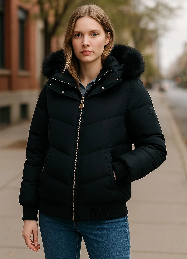 Water repellent Hooded Faux fur lined hood Super warm Pockets Side snap button Puffer