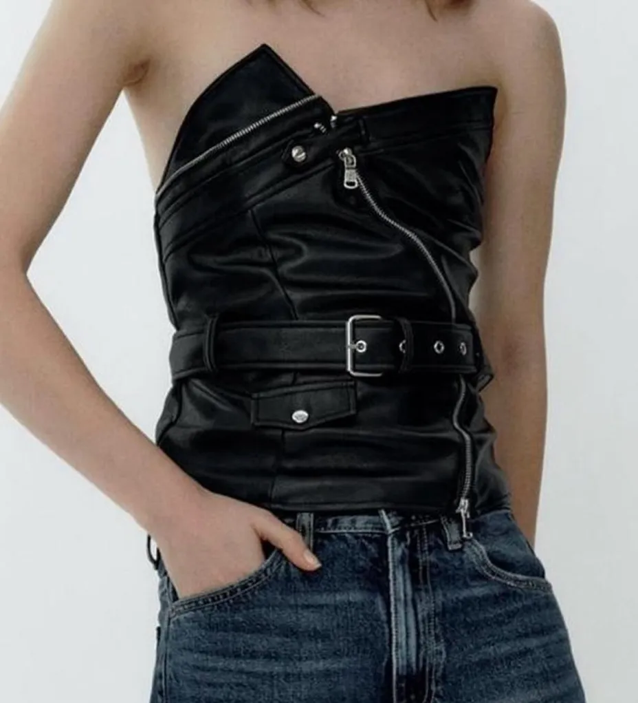 New with tags Moto details zippers and straps Stylish black strapless leather top with zipper and b... Show more