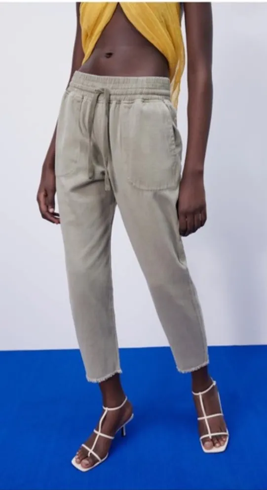 Zara Light Green The Raw Hem Denim Joggers. With front and back pockets, and elastic waist.