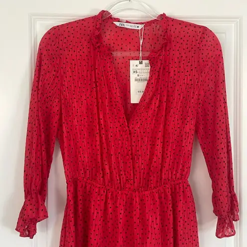 NWT Zara Polka Dot Midi Dress Size: XS Color: Red with Black Polka Dots Dress with ruffled round ne... Show more