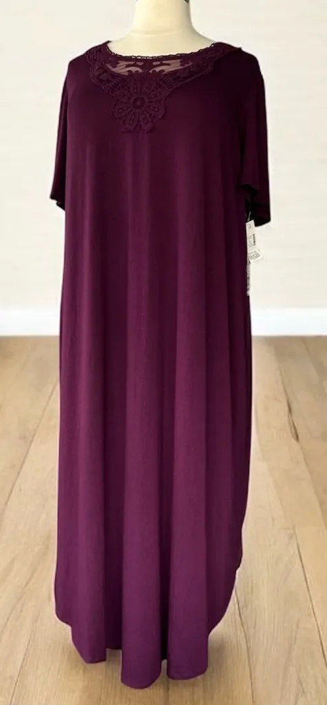Chic midi dress in deep purple. Features elegant lace neckline. Perfect for versatile styling. New tags Super soft Crochet with lace insert necklace Short sleeve Rounded Hemline Button closure at neck line