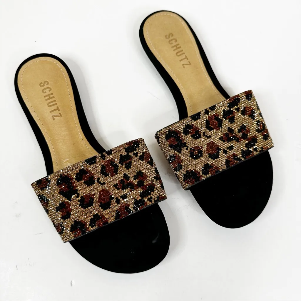 Schutz Dixie Leopard Rhinestone Sandals Womens 7 Open Toe Slide Flats Brown - $55 - From Jennifer