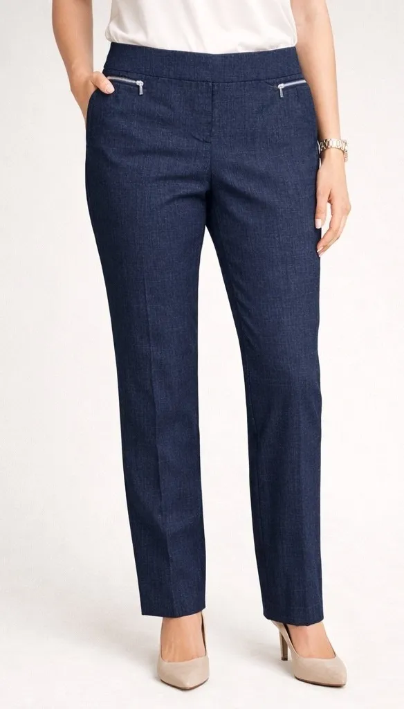 Classic and polished — these New York & Company 7th Avenue Petite pants offer a tailored, professional look that transitions effortlessly from the office to after-hours. Designed in a navy blue woven fabric with sleek zip-front pockets and a straight-leg silhouette for a flattering fit. Details: • Brand: New York & Company • Collection: 7th Avenue Suiting • Size: 10 Petite (10P) • Color: Navy blue • Features: Zip front pockets, straight leg, mid-rise waist, back welt pockets • Material: Polyester/rayon/spandex blend (light stretch) • Condition: Excellent preowned — no stains, tears, or pilling Measurements (approx): • Waist: 16" flat • Rise: 9.5" • Inseam: 28" Style Tip: Pair with a crisp white blouse and heels for a classic workday look, or a tucked-in tee for modern smart casual style.