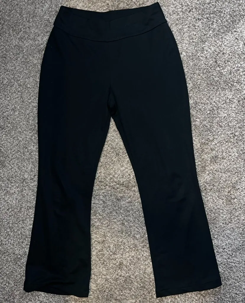 #dresspantyogapants #flarepants #businesscasual #y2k #nyandcompany No material tag, but feels like a high-quality, substantial ponte knit (likely a Rayon/Nylon/Spandex blend) with excellent stretch and structure. IMPORTANT SIZING NOTE: The size is estimated as a Women's Medium/Large (Size 8/10) based on the 15-inch flat waist measurement. The provided size of 'XS' does not align with the measurements. Please rely on the measurements provided to ensure a proper fit. The 27-inch inseam creates a cropped/ankle-length flare. Excellent pre-owned condition.